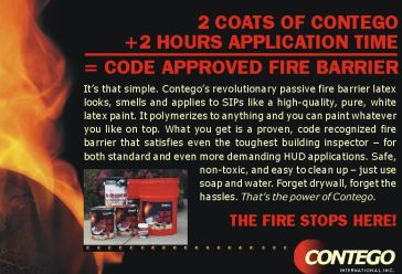 Contego International Fire Retardant Intumescent paint coating is a heavy-bodied, single-part latex designed for use on construction materials such as Oriented Strand Board (OSB), Structural Insulated Panels (SIPS), framing lumber, plywood, trusses, drywall, doors, and more. May also be used on aluminum and steel sheets, round and box steel columns. When exposed to fire, Contego International fire retardant coatings expand to form a tough char barrier fire cannot penetrate. Deprived of fuel, the fire quickly dies. The products are all non-toxic, non-carcinogenic, non-dermatic and safe for pets. Contego International Passive Fire Barrier Latex primer represents a quantum leap forward in terms of quality, versatility, affordability and fire safety-all in one truly impressive fire proofing product. Click the photograph for more details. |